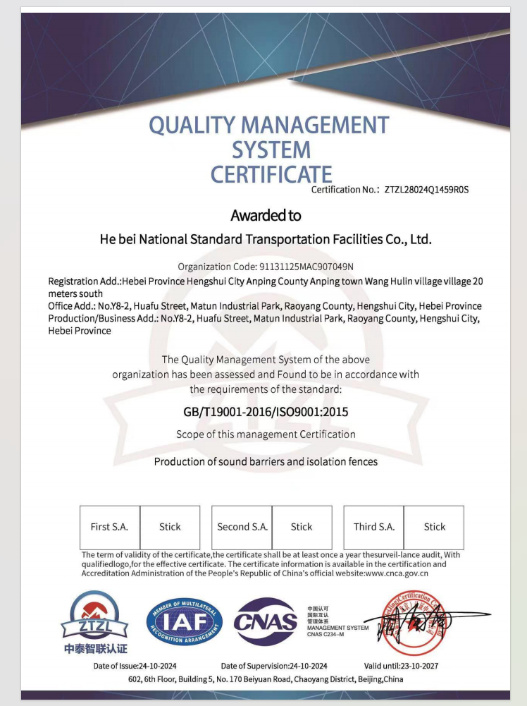 Hebei Guobiao Traffic Facilities Co., Ltd., established in 2008, is a professional manufacturer of sound barriers, metal hoardings, various guardrail nets and metal wire meshes, located in Anping County, Hengshui City, Hebei Province — the famous Hometown of Wire Mesh in China.With years of R&D experience, we stick to technological innovation, scientific management and honest operation. We adopt advanced production equipment and standardized production mode, and strictly control all key procedures to ensure stable product quality, which has won high recognition from customers.Upholding the principle of quality for survival and reputation for development, we are committed to offering premium products and top-tier services for global customers.We sincerely look forward to cooperating with new and old customers for mutual development and shared prosperity.